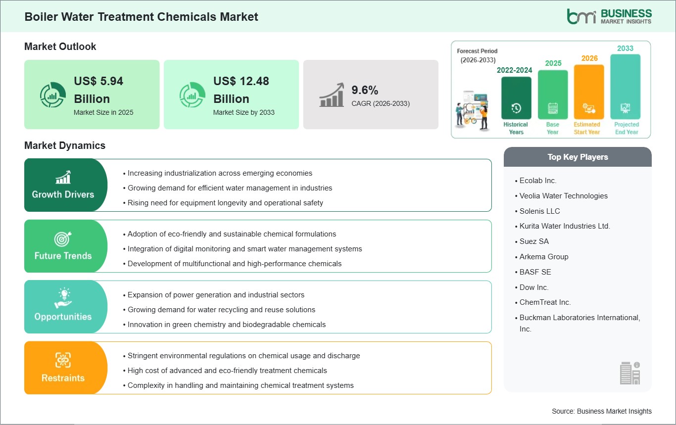 The Boiler Water Treatment Chemicals Market size is expected to reach US$ 12.48 billion by 2033 from US$ 5.94 billion in 2025. The market is estimated to record a CAGR of 9.6% from 2026 to 2033.