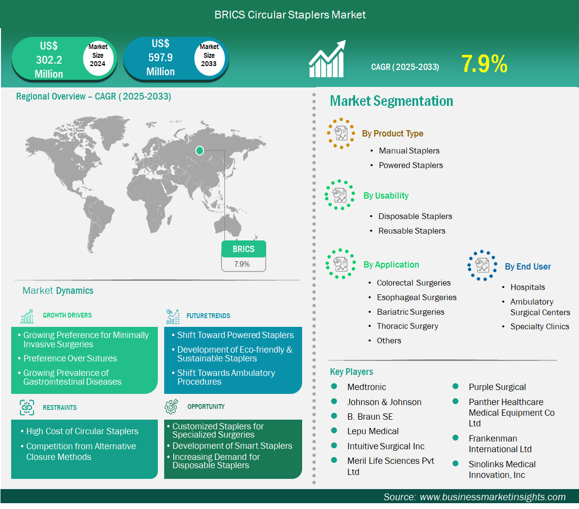 As per our report BRICS Circular Staplers Market, the market size is valued at US$ 302.2 Million in 2024, projecting it to reach US$ 597.9 Million by 2033. This translates to a CAGR of approximately 7.9% during the forecast period.