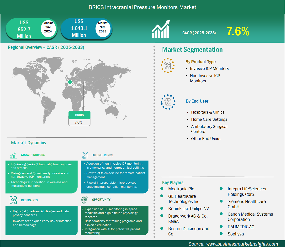 The BRICS Intracranial Pressure Monitors Market is valued at US$ 852.7 Million in 2024, it is projected to reach US$ 1,643.1 Million by 2033.