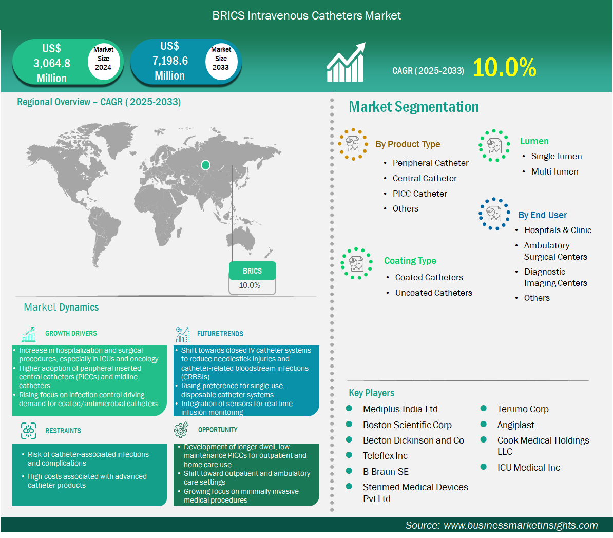 As per our report BRICS Intravenous Catheters Market, the market size is valued at US$ 3,064.8 Million in 2024, projecting it to reach US$ 7,198.6 Million by 2033. This translates to a CAGR of approximately 10.0% during the forecast period.