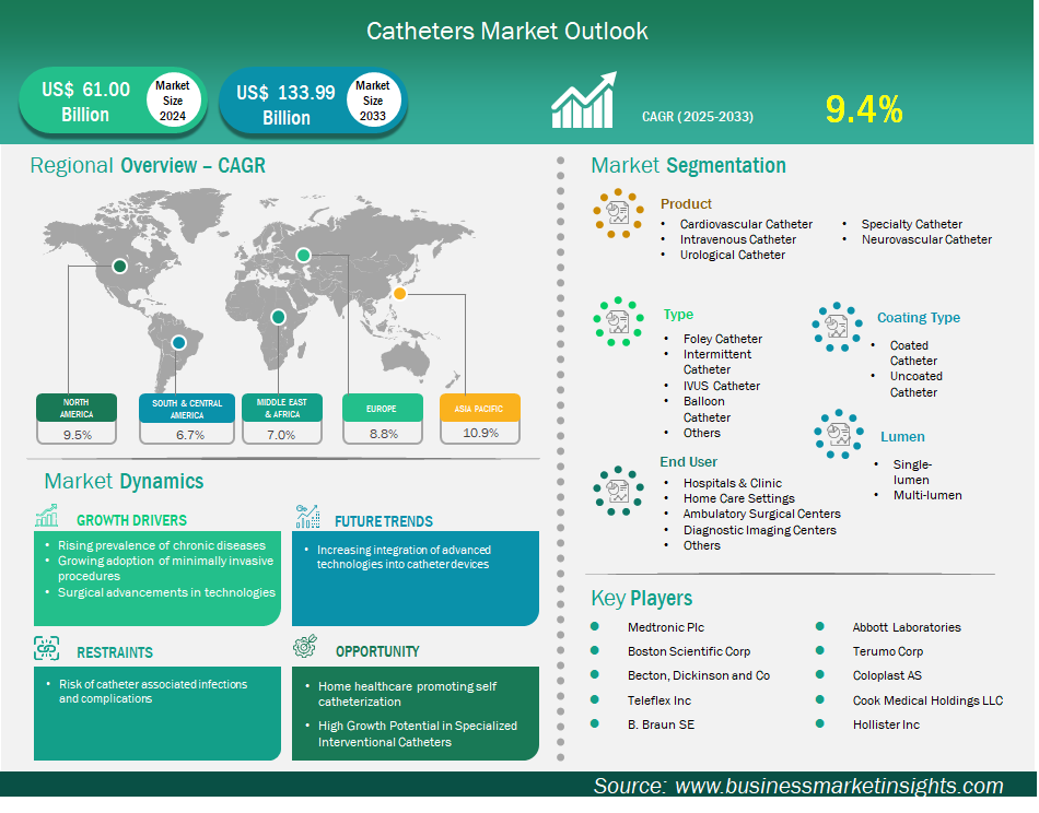 As per our report Catheters Market, the market size is valued at US$ 61,000.3 Million in 2024, projecting it to reach US$ 133,987.1 Million by 2033. This translates to a CAGR of approximately 9.4% during the forecast period.