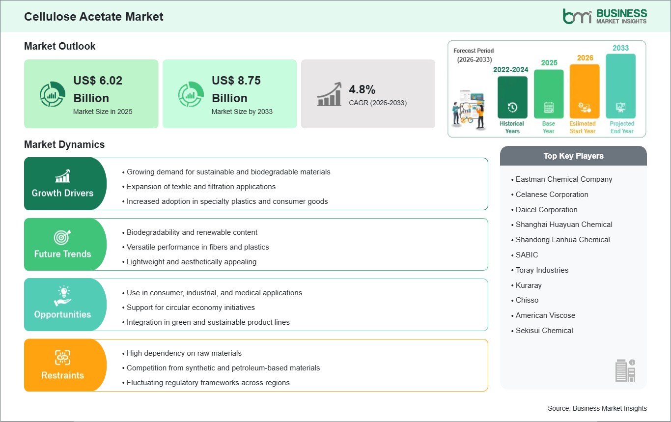 As per our report Cellulose Acetate Market, the market size is valued at US$ 6.02 Billion in 2025, projecting it to reach US$ 8.75 Billion by 2033. This translates to a CAGR of approximately 4.8% during the forecast period.