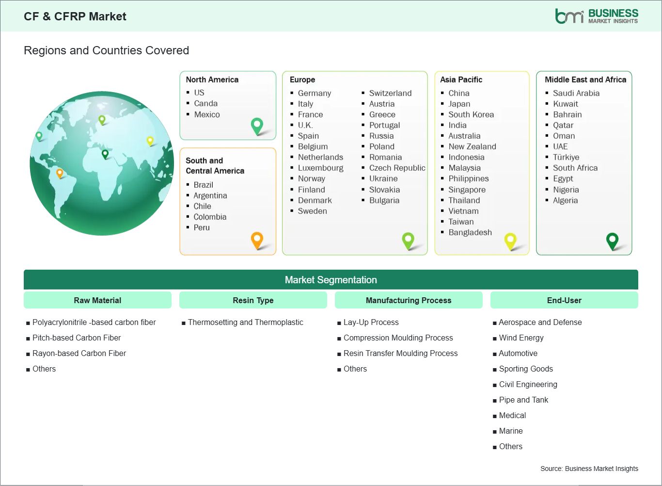 The geographical scope of the CF & CFRP market report is divided into five regions: North America, Europe, Asia Pacific, the Middle East & Africa, and South & Central America.