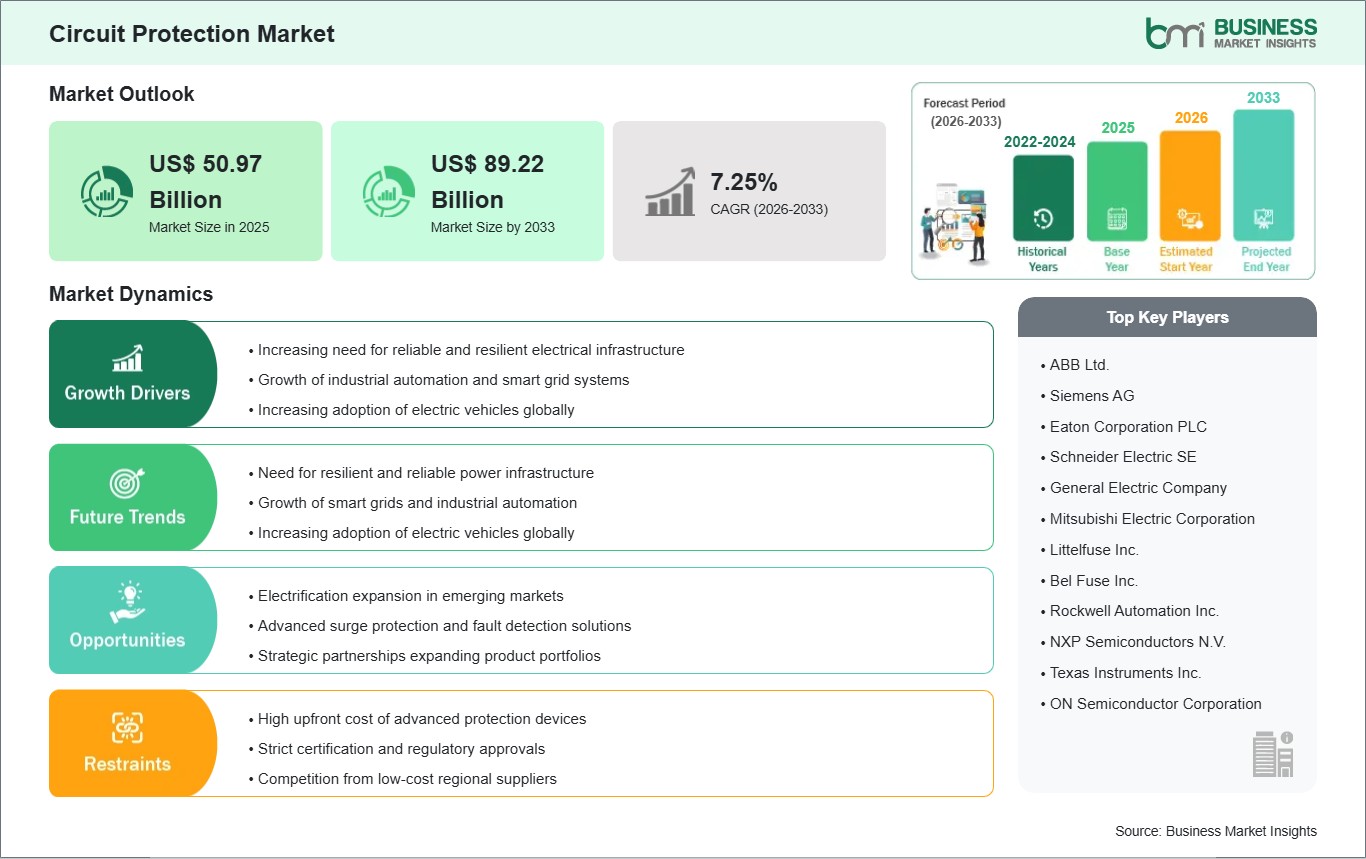 The Circuit Protection Market is valued at US$ 50.97 Billion in 2025, it is projected to reach US$ 89.22 Billion by 2033.