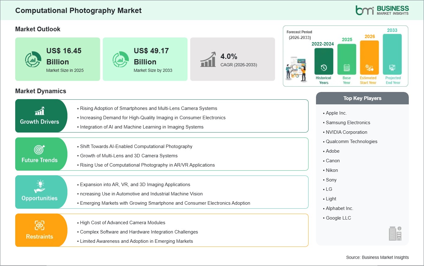 As per our report Computational Photography Market, the market size is valued at US$ 16.45 Billion in 2025, projecting it to reach US$ 49.17 Billion by 2033. This translates to a CAGR of approximately 4.0% during the forecast period.