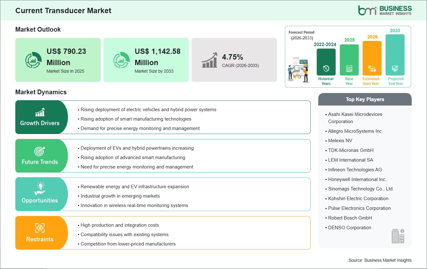 The Current Transducer Market is valued at US$ 790.23 Million in 2025, it is projected to reach US$ 1,142.58 Million by 2033.