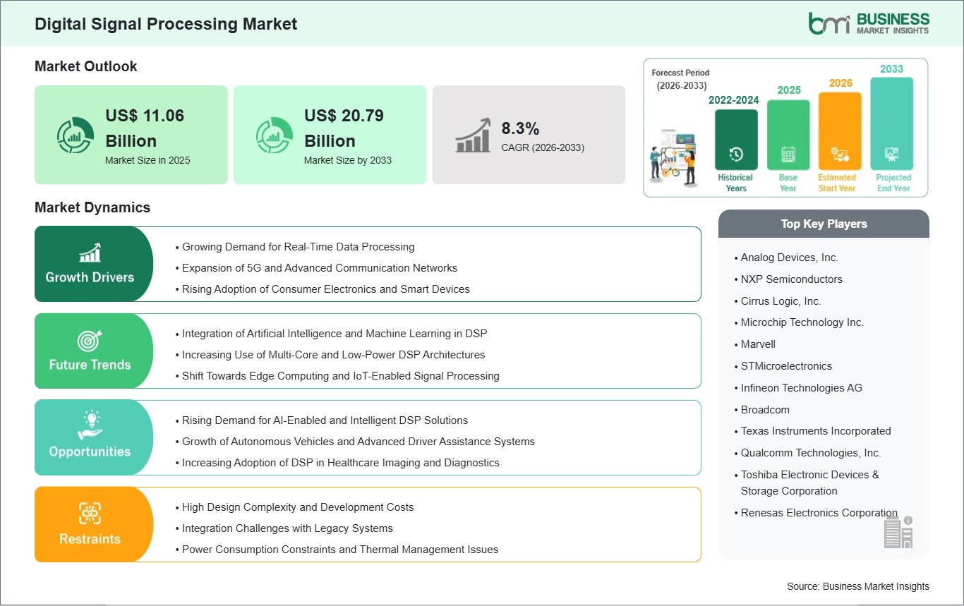 The Digital Signal Processing Market is valued at US$ 11.06 Billion in 2025, it is projected to reach US$ 20.79 Billion by 2033.