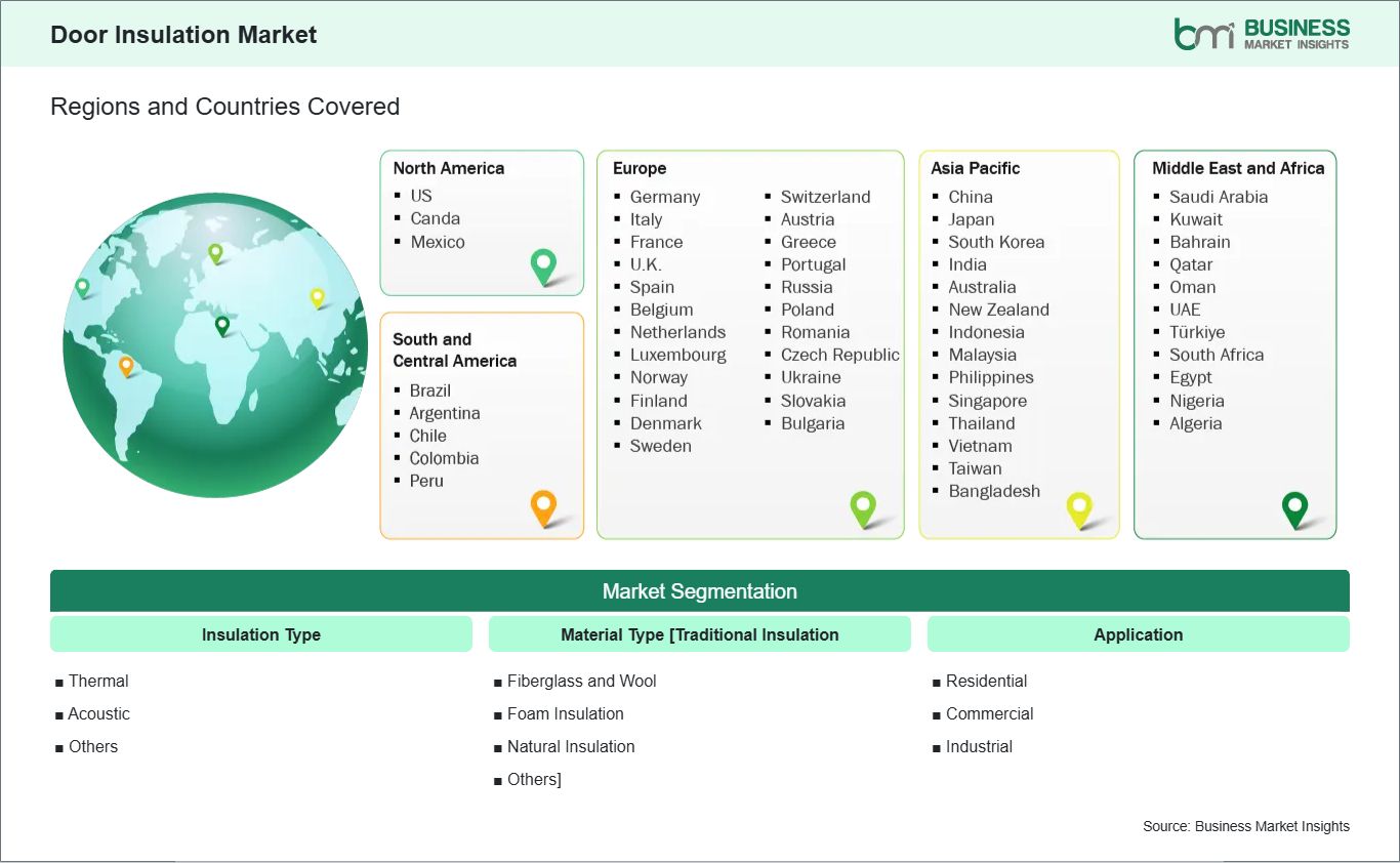 The geographical scope of the Door Insulation market report is divided into five regions: North America, Asia Pacific, Europe, Middle East & Africa, and South & Central America. The Asia Pacific Door Insulation Market is segmented into China, Japan, South Korea, India, Australia, New Zealand, Indonesia, Malaysia, the Philippines, Singapore, Thailand, Vietnam, Taiwan, Bangladesh, and the Rest of Asia Pacific. Asia Pacific`s rapid urbanization and infrastructure development, especially in residential construction, commercial buildings, and industrial facilities, help make it a key region for door insulation market expansion.
