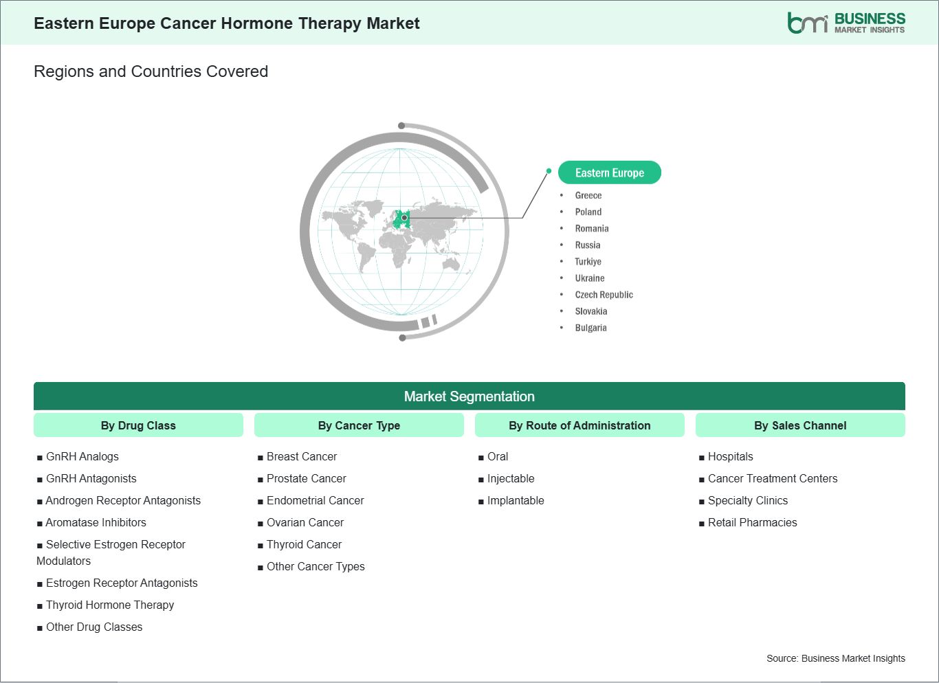 The geographical scope of the Eastern Europe Cancer Hormone Therapy market report is divided into: Russia, Poland, Romania, the Czech Republic, Ukraine, Romania, Greece, Slovakia, and Bulgaria. Russia held the largest share in 2024.