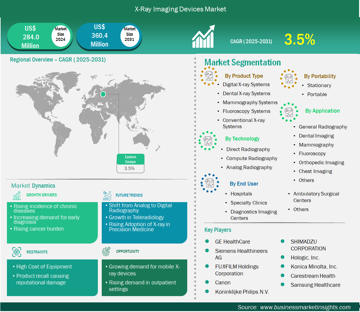 The Eastern Europe X-Ray Imaging Devices Market is valued at US$ 284.0 Million in 2024, it is projected to reach US$ 360.4 Million by 2031.