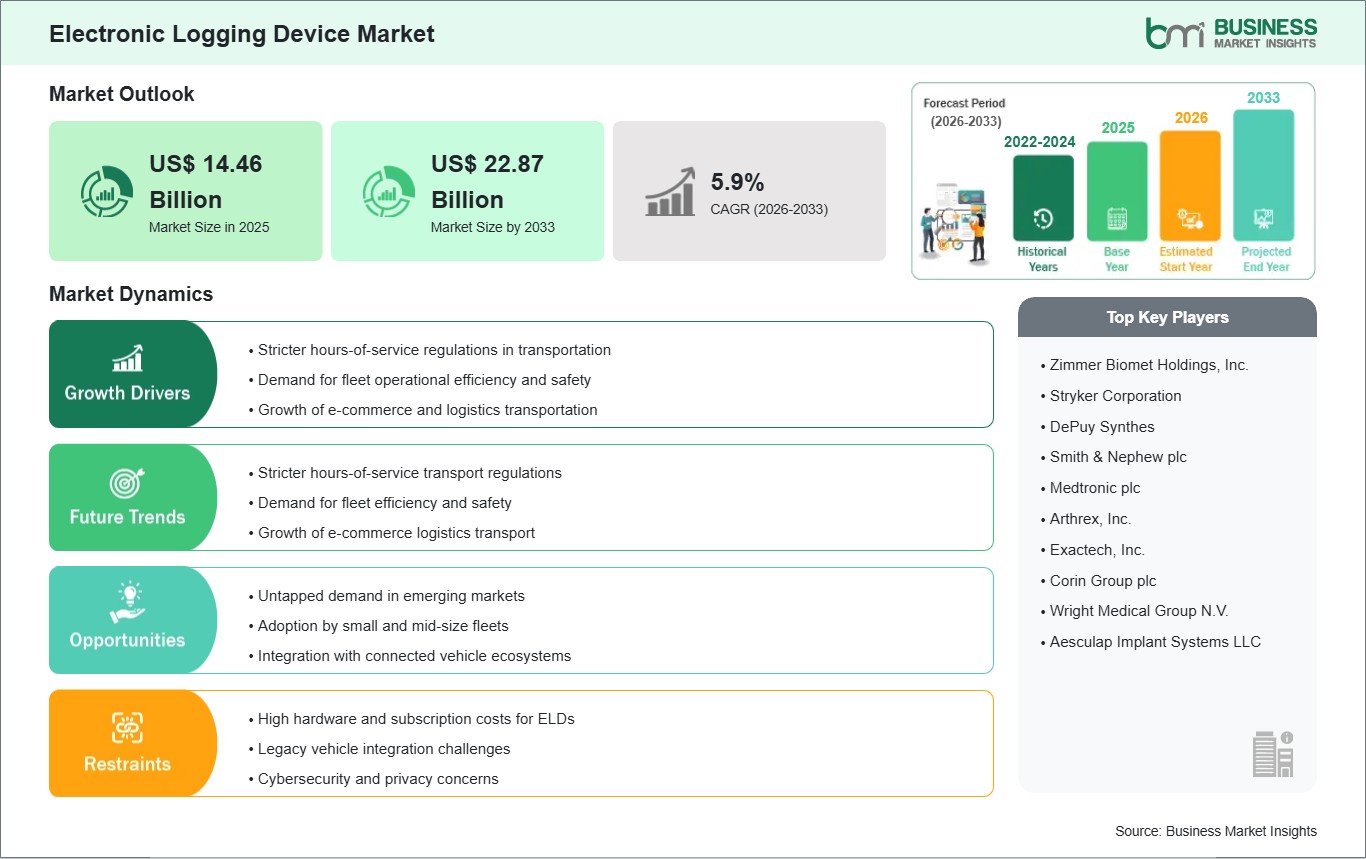 The Electronic Logging Device Market is valued at US$ 14.46 Billion in 2025, it is projected to reach US$ 22.87 Billion by 2033.
