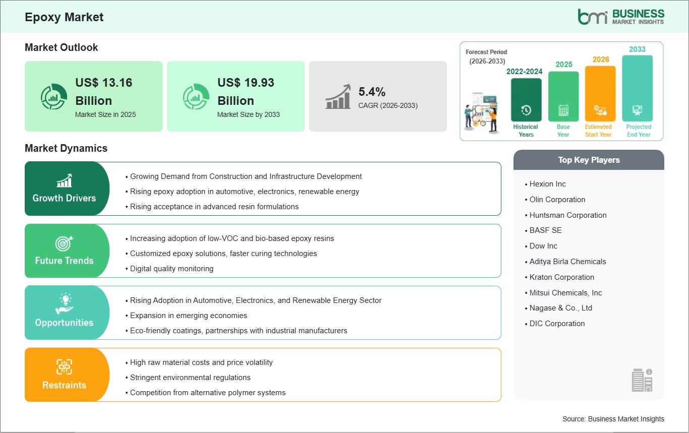 As per our report Epoxy Market, the market size is valued at US$ 13.16 Billion in 2025, projecting it to reach US$ 19.93 Billion by 2033. This translates to a CAGR of approximately 5.4% during the forecast period.