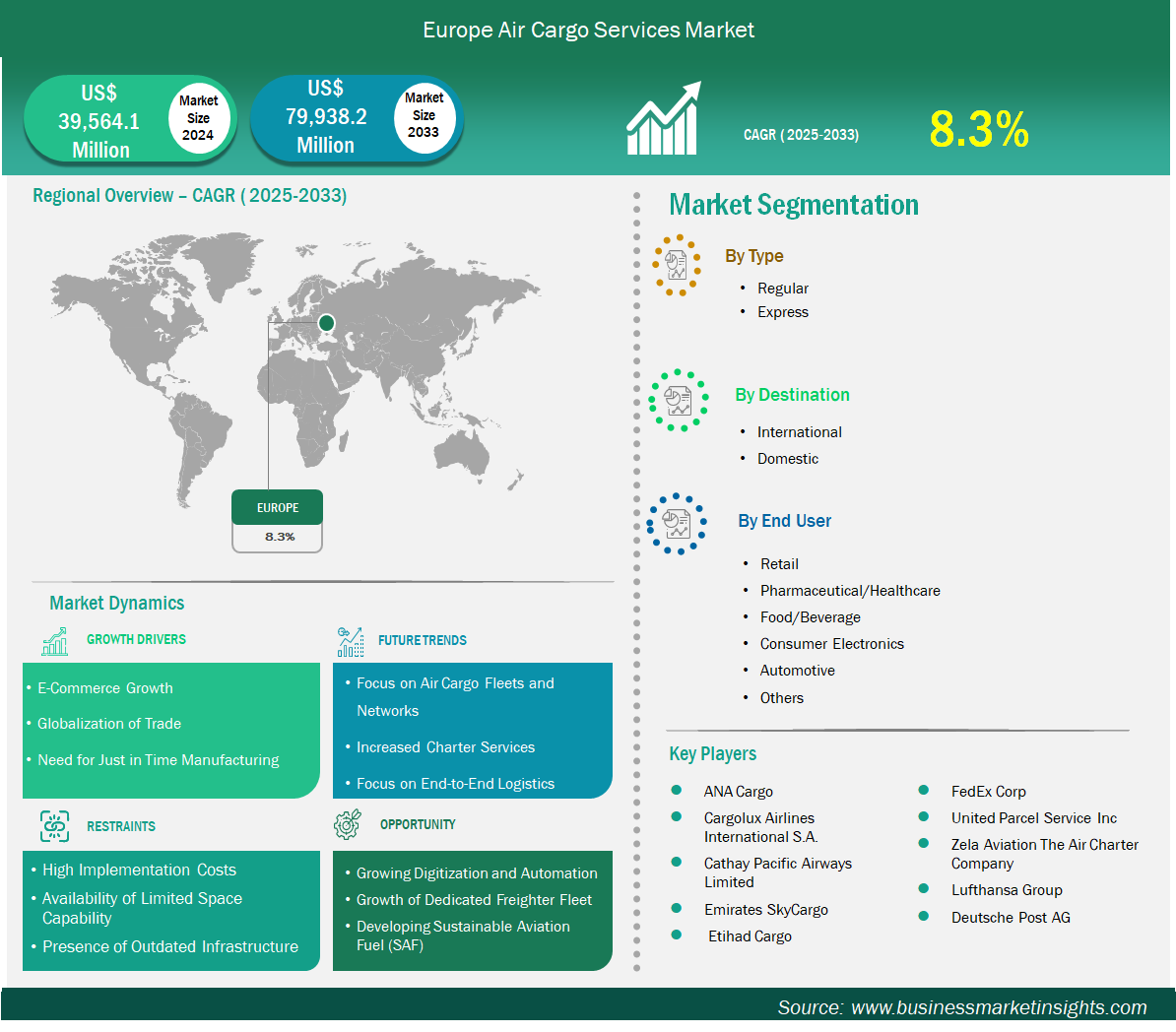 As per our report Europe Air Cargo Services Market, the market size is valued at US$ 39,564.1 Million in 2024, projecting it to reach US$ 79,938.2 Million by 2033. This translates to a CAGR of approximately 8.3% during the forecast period.