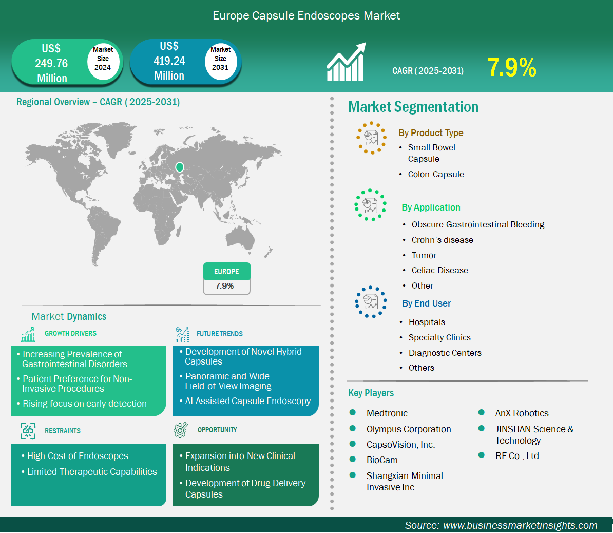 The Europe capsule endoscopes market size is expected to reach US$ 419.24 million by 2031 from US$ 249.76 million in 2024. The market is estimated to record a CAGR of 7.9% from 2025 to 2031.