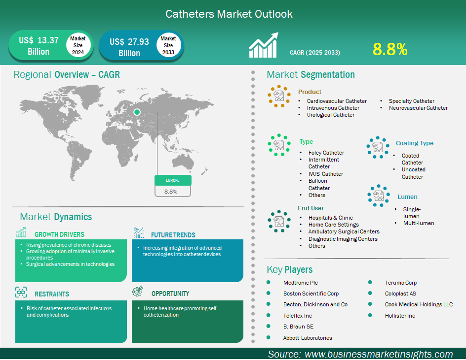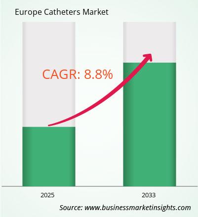 Europe catheters market size is expected to reach US$ 27,930.8 million by 2033 from US$ 13,374.9 million in 2024. The market is estimated to record a CAGR of 8.8% from 2025 to 2033.
