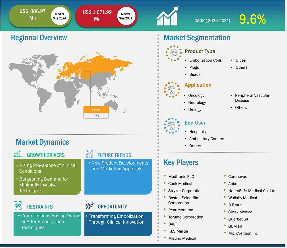 The Europe Embolization Devices Market is valued at US$ 886.97 Million in 2024, it is projected to reach US$ 1,671.99 Million by 2031.
