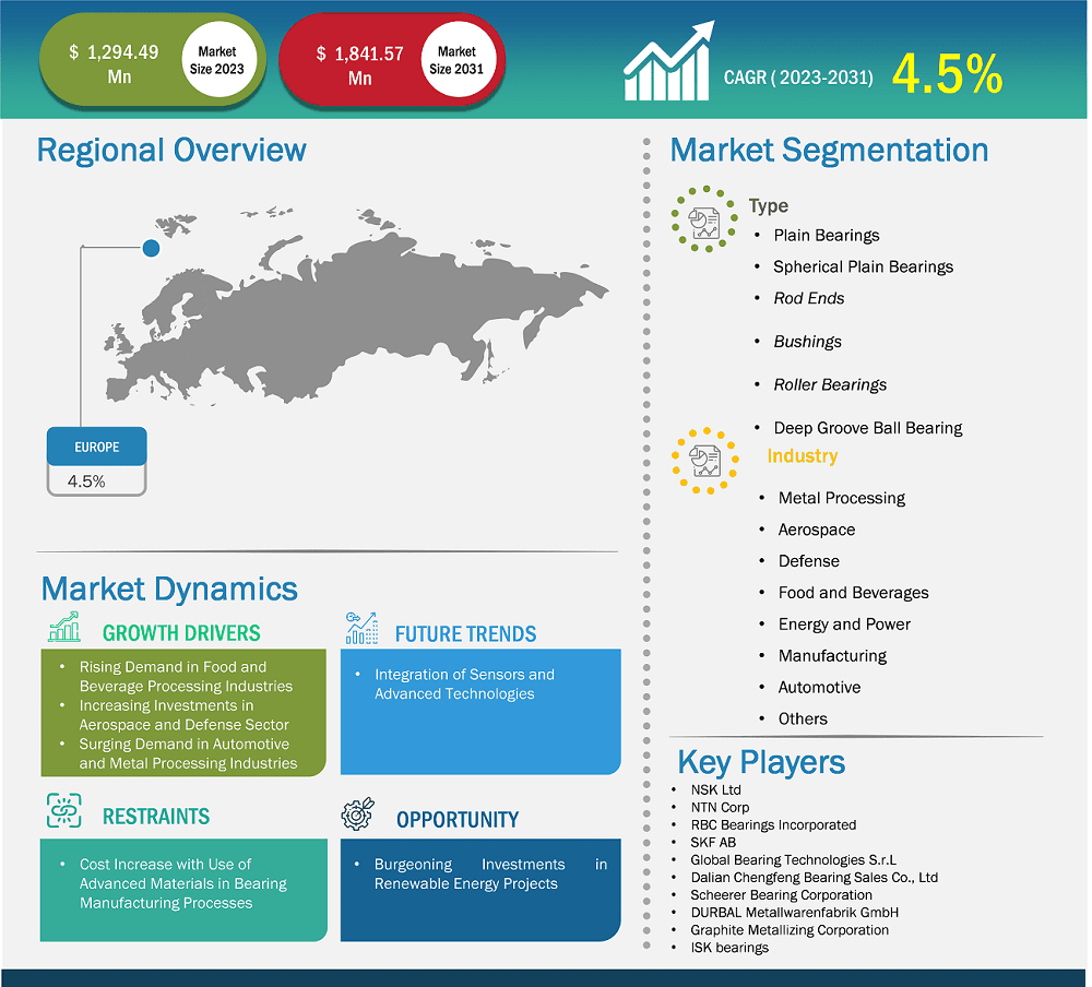 As per our report Europe High Heat Bearing Market, the market size is valued at US$ 1,294.49 Million in 2023, projecting it to reach US$ 1,841.57 Million by 2031. This translates to a CAGR of approximately 4.5% during the forecast period.