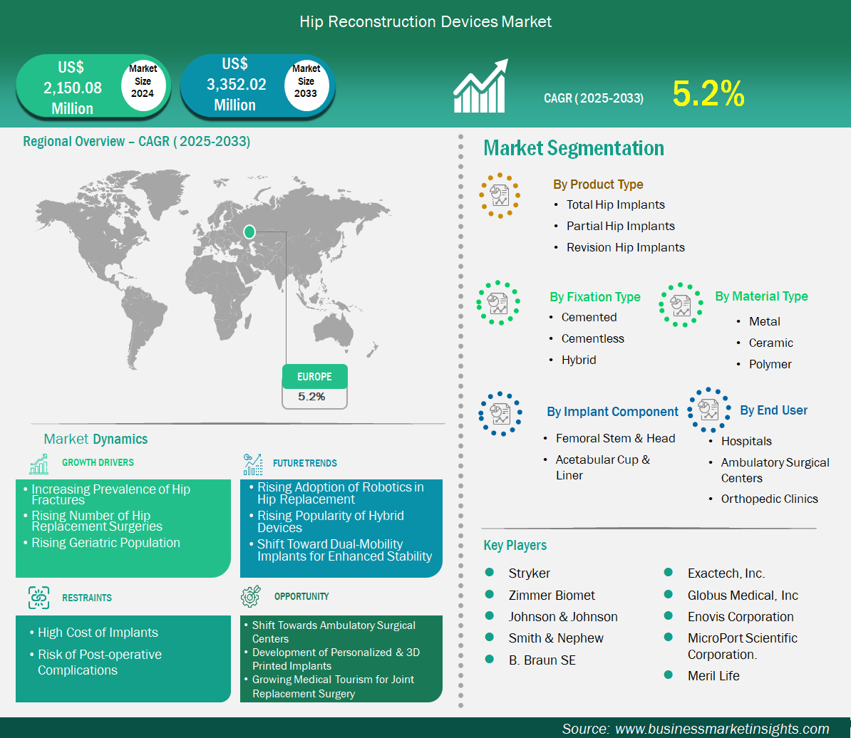 As per our report Europe Hip Reconstruction Devices Market, the market size is valued at US$ 2,150.08 Million in 2024, projecting it to reach US$ 3,352.02 Million by 2033. This translates to a CAGR of approximately 5.2% during the forecast period.