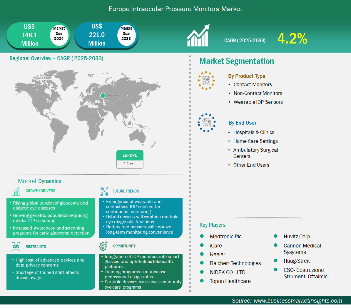 As per our report Europe Intraocular Pressure Monitors Market, the market size is valued at US$ 148.1 Million in 2024, projecting it to reach US$ 221.0 Million by 2033. This translates to a CAGR of approximately 4.2% during the forecast period.