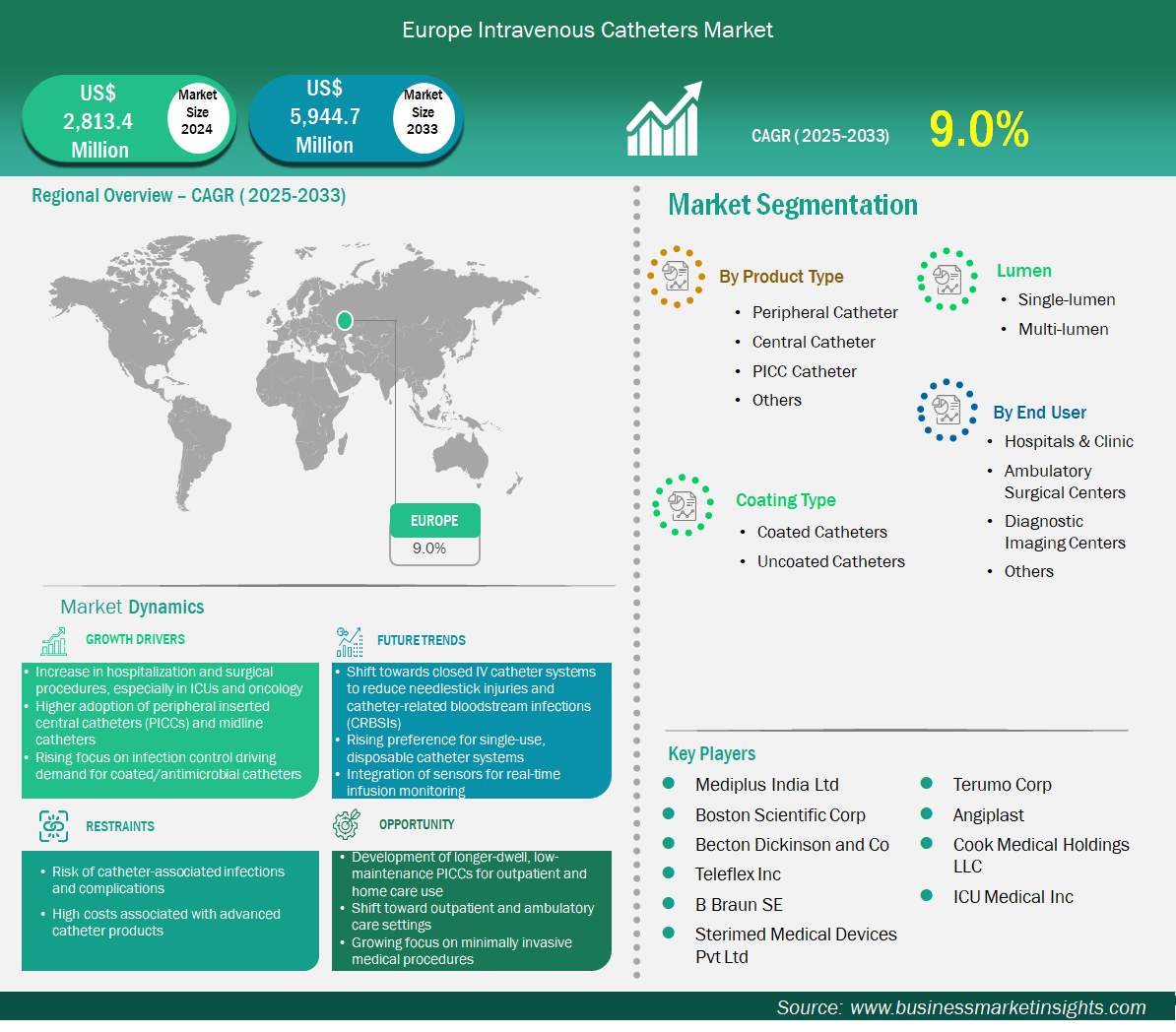 As per our report Europe Intravenous Catheters Market, the market size is valued at US$ 2,813.4 Million in 2024, projecting it to reach US$ 5,944.7 Million by 2033. This translates to a CAGR of approximately 9.0% during the forecast period.