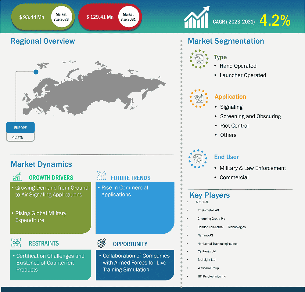 The Europe Smoke Grenade Market is valued at US$ 93.44 Million in 2023, it is projected to reach US$ 129.41 Million by 2031.