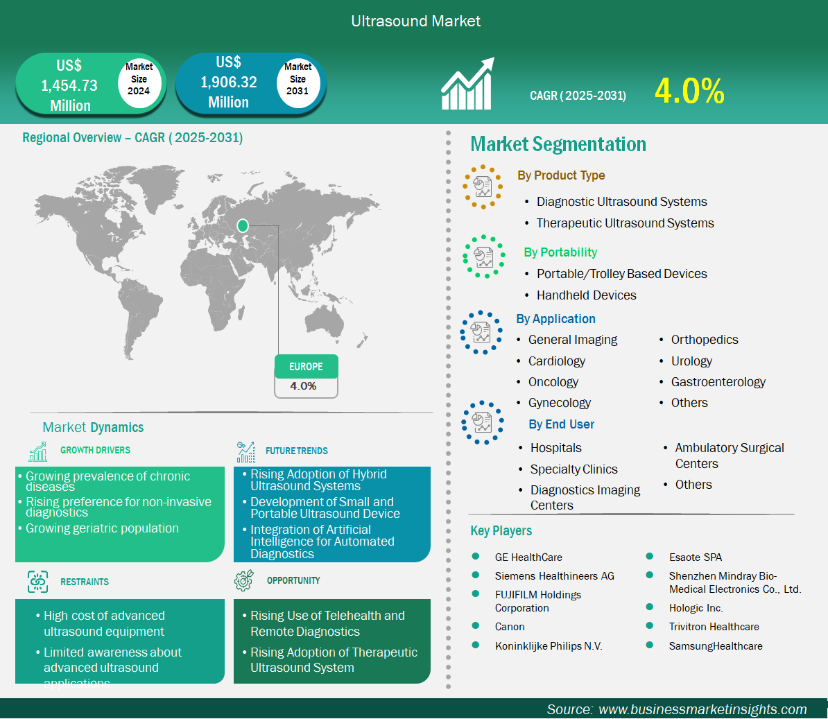 As per our report Europe Ultrasound Market, the market size is valued at US$ 1,454.73 Million in 2024, projecting it to reach US$ 1,906.32 Million by 2031. This translates to a CAGR of approximately 4.0% during the forecast period.