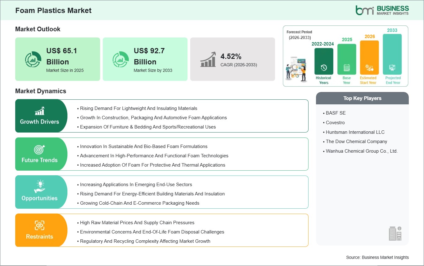 The Foam Plastics Market is valued at US$ 65.1 Billion in 2025, it is projected to reach US$ 92.7 Billion by 2033.