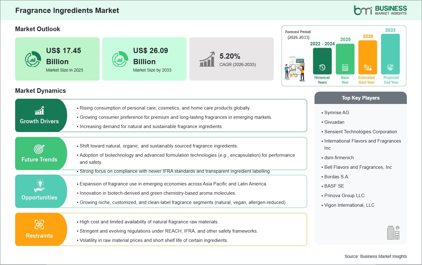 As per our report Fragrance Ingredients Market, the market size is valued at US$ 17.45 Billion in 2025, projecting it to reach US$ 26.09 Billion by 2033. This translates to a CAGR of approximately 5.20% during the forecast period.