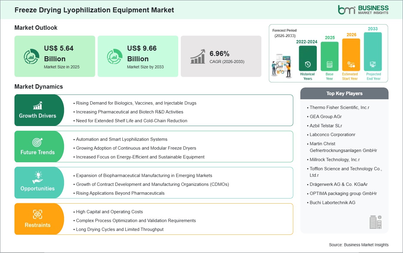 The Freeze Drying Lyophilization Equipment Market is valued at US$ 5.64 Billion in 2025, it is projected to reach US$ 9.66 Billion by 2033.