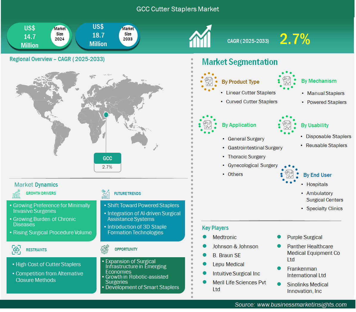 The GCC cutter staplers market size is expected to reach US$ 18.7 million by 2033 from US$ 14.7 million in 2024. The market is estimated to record a CAGR of 2.7% from 2025 to 2033.