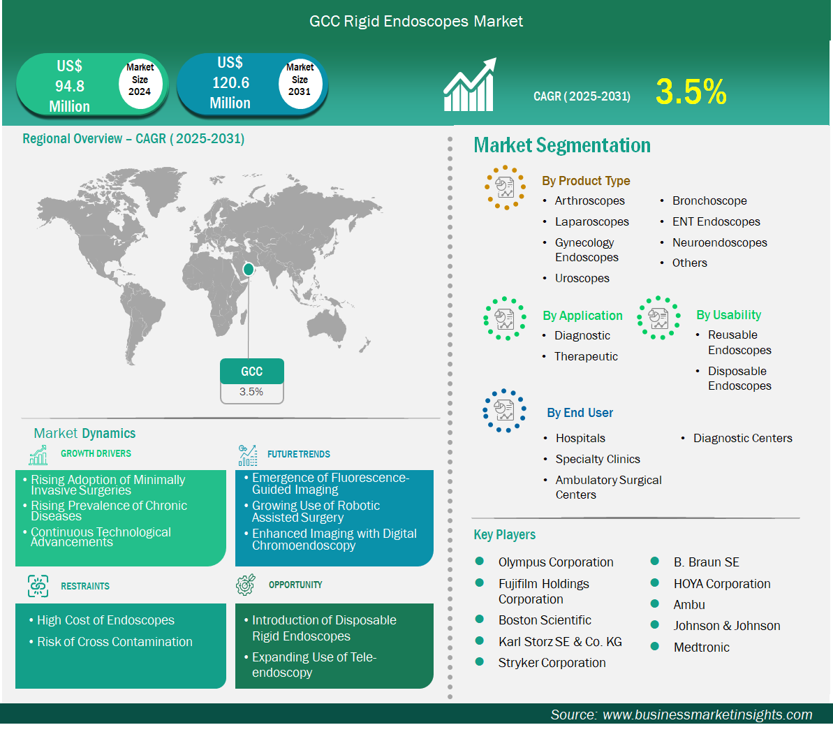 The GCC Rigid Endoscopes Market is valued at US$ 94.8 Million in 2024, it is projected to reach US$ 120.6 Million by 2031.