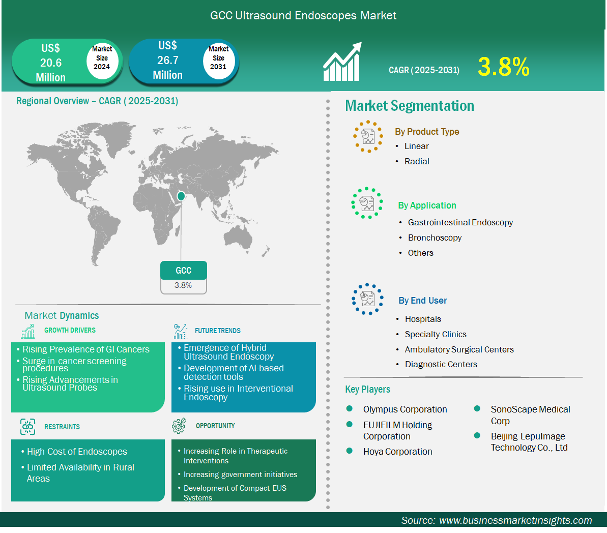 The GCC ultrasound endoscopes market size is expected to reach US$ 26.7 million by 2031 from US$ 20.6 million in 2024. The market is estimated to record a CAGR of 3.8% from 2025 to 2031.