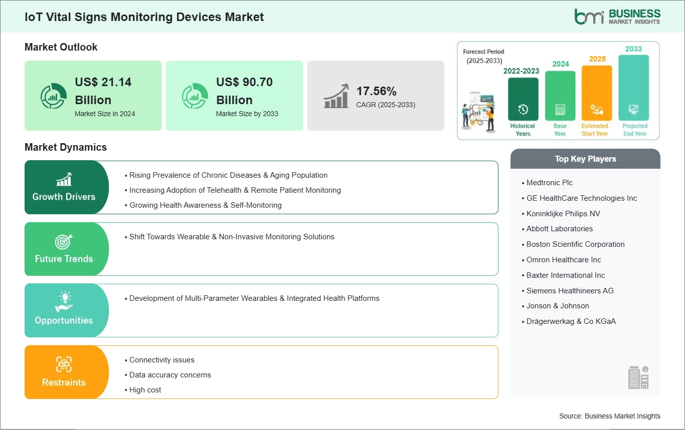 The IoT Vital Signs Monitoring Devices Market is valued at US$ 21.14 Billion in 2024, it is projected to reach US$ 90.70 Billion by 2033.