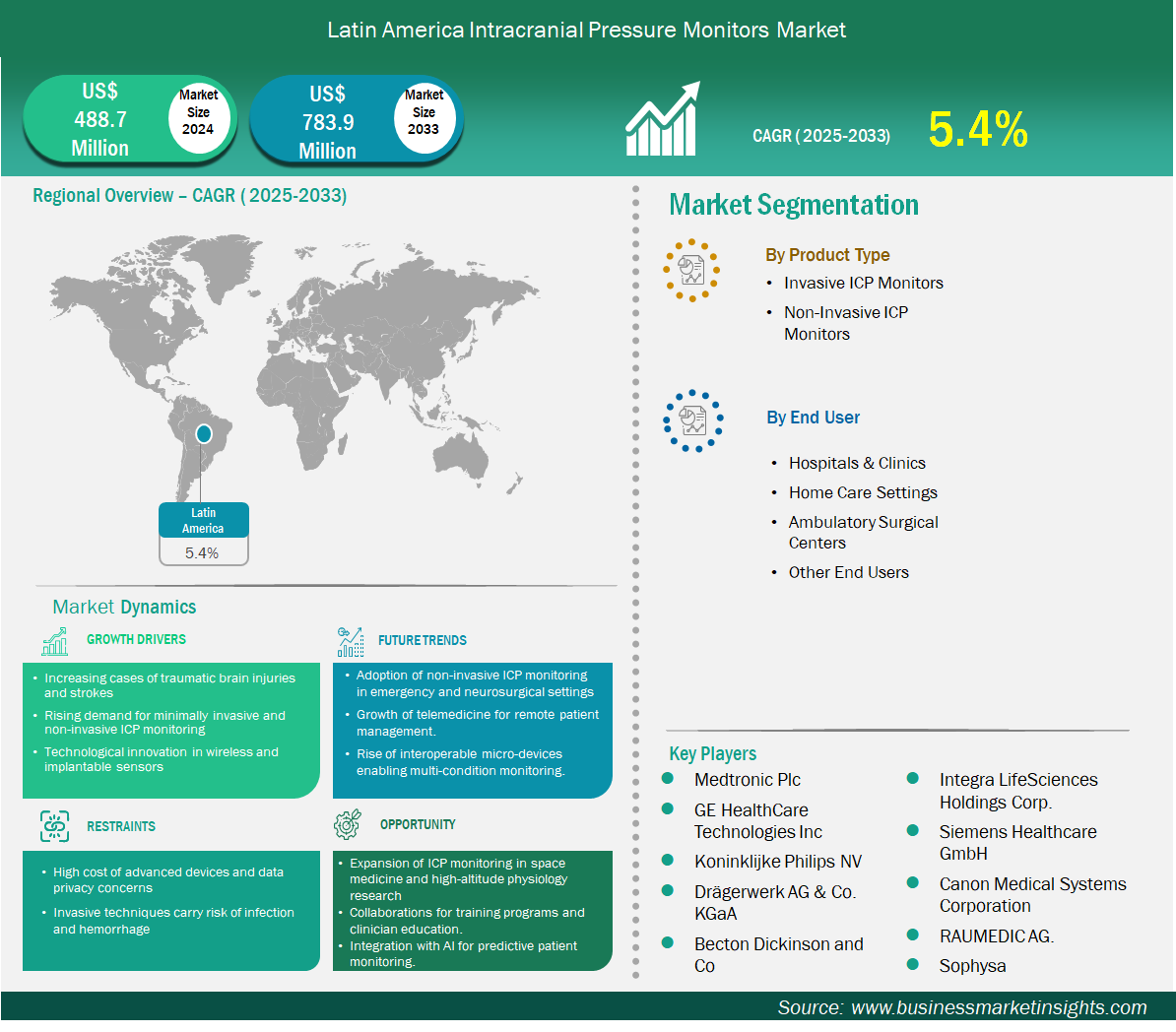 The Latin America Intracranial Pressure Monitors Market is valued at US$ 488.7 Million in 2024, it is projected to reach US$ 783.9 Million by 2033.
