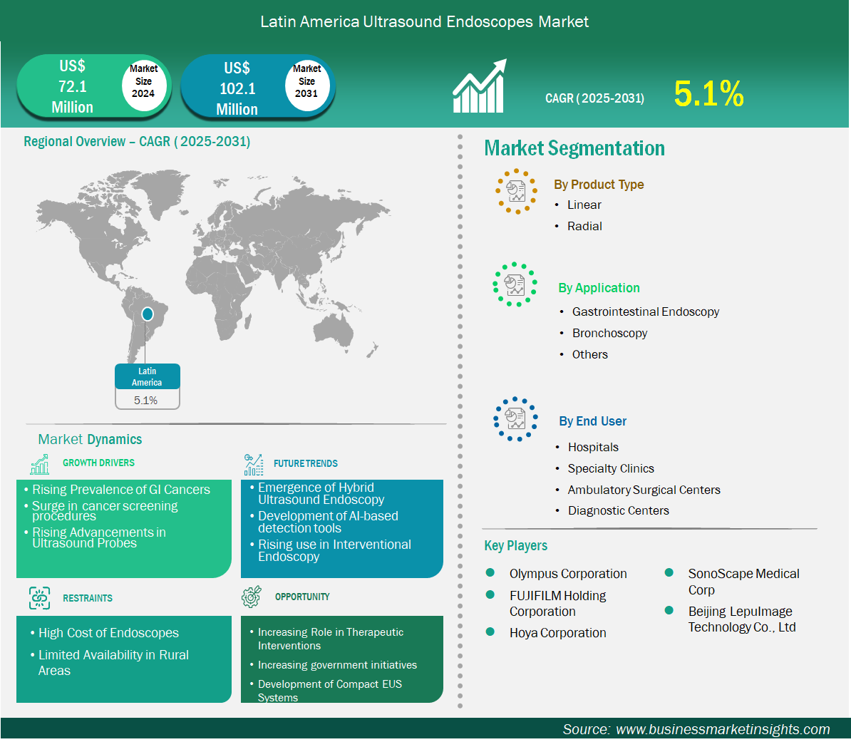 As per our report Latin America Ultrasound Endoscopes Market, the market size is valued at US$ 72.1 Million in 2024, projecting it to reach US$ 102.1 Million by 2031. This translates to a CAGR of approximately 5.1% during the forecast period.