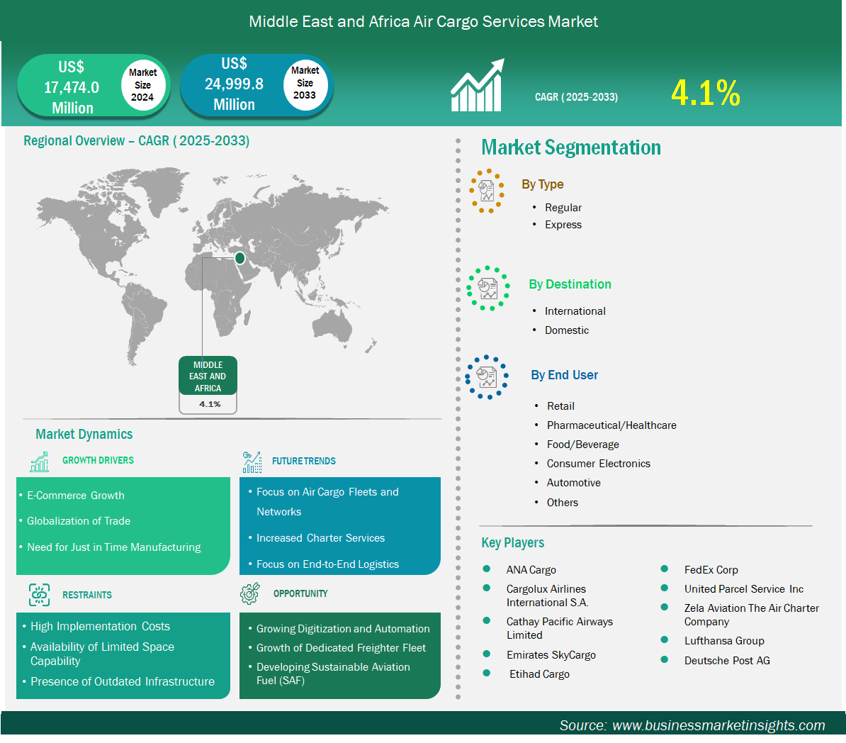 The Middle East and Africa Air Cargo Services Market is valued at US$ 17,474.0 Million in 2024, it is projected to reach US$ 24,999.8 Million by 2033.