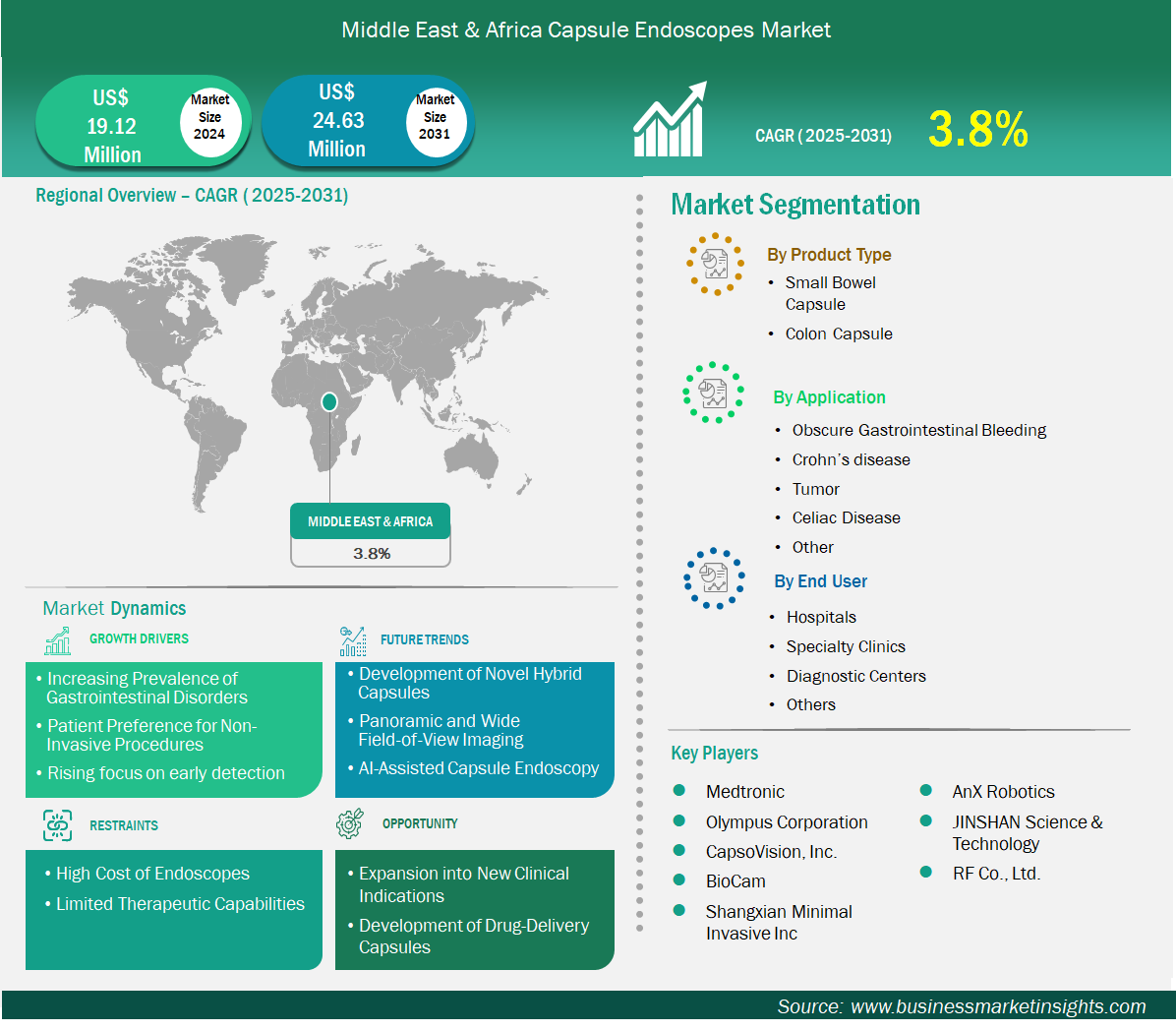 The Middle East and Africa Capsule Endoscopes Market is valued at US$ 19.12 Million in 2024, it is projected to reach US$ 24.63 Million by 2031.