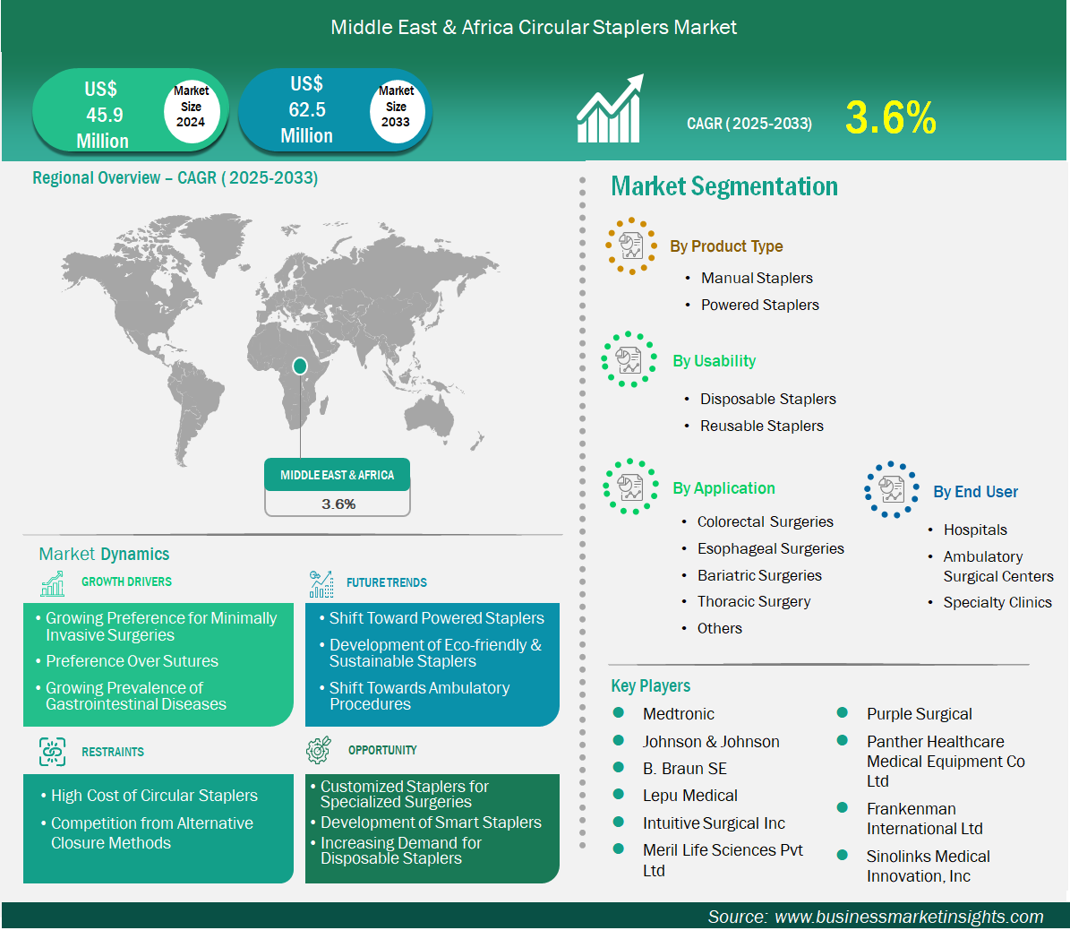 As per our report Middle East and Africa Circular Staplers Market, the market size is valued at US$ 45.9 Million in 2024, projecting it to reach US$ 62.5 Million by 2033. This translates to a CAGR of approximately 3.6% during the forecast period.