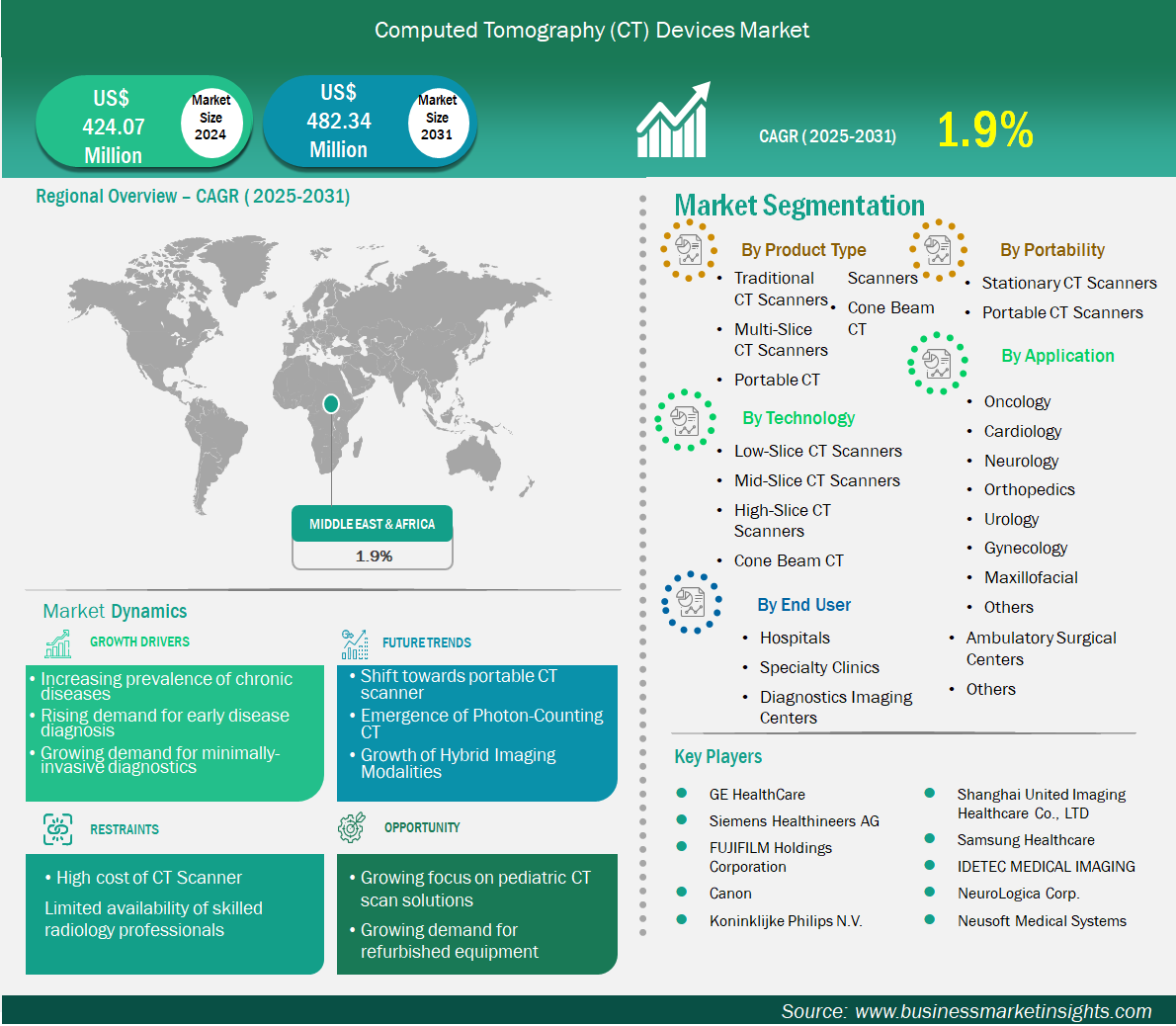 The Middle East & Africa Computed Tomography (CT) Devices Market is valued at US$ 424.07 Million in 2024, it is projected to reach US$ 482.34 Million by 2031.