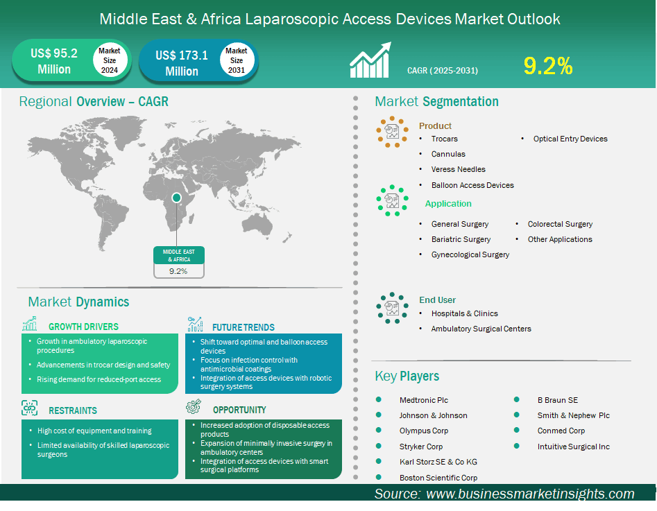The Middle East and Africa Laparoscopic Access Devices Market is valued at US$ 95.2 Million in 2024, it is projected to reach US$ 173.1 Million by 2031.