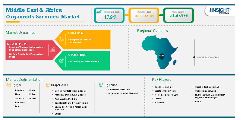 The Middle East & Africa organoids services market size is expected to reach US$ 289.76 million by 2031 from US$$ 91.55 million in 2024. The market is estimated to record a CAGR of 17.9% from 2024 to 2031.