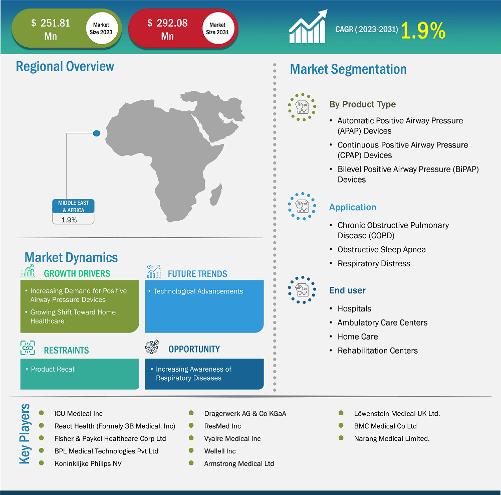 As per our report Middle East & Africa Positive Airway Pressure (PAP) Devices Market, the market size is valued at US$ 251.81 Million in 2023, projecting it to reach US$ 292.08 Million by 2031. This translates to a CAGR of approximately 1.9% during the forecast period.