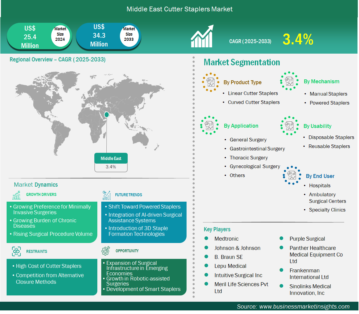 The Middle East cutter staplers market size is expected to reach US$ 34.3 million by 2033 from US$ 25.4 million in 2024. The market is estimated to record a CAGR of 3.4% from 2025 to 2033.