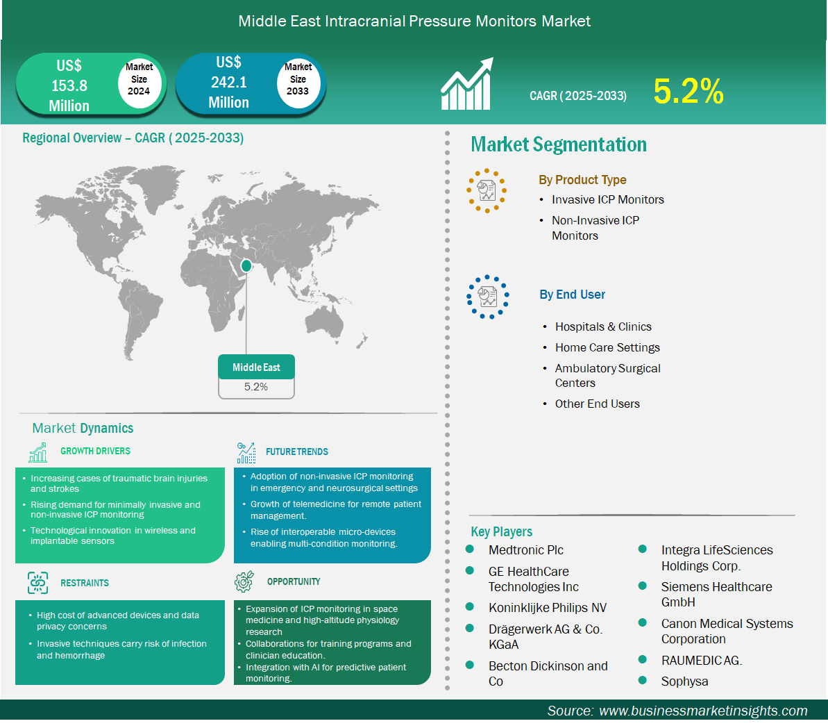 The Middle East Intracranial Pressure Monitors Market is valued at US$ 153.8 Million in 2024, it is projected to reach US$ 242.1 Million by 2033.