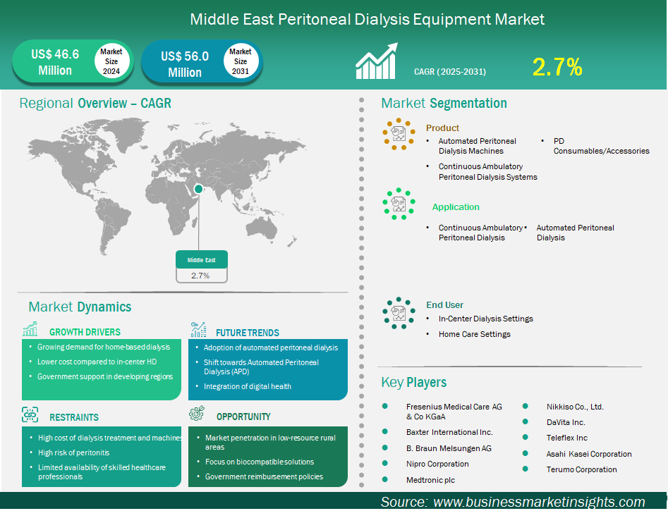 The Middle East Peritoneal Dialysis Equipment Market is valued at US$ 46.6 Million in 2024, it is projected to reach US$ 56.0 Million by 2031.