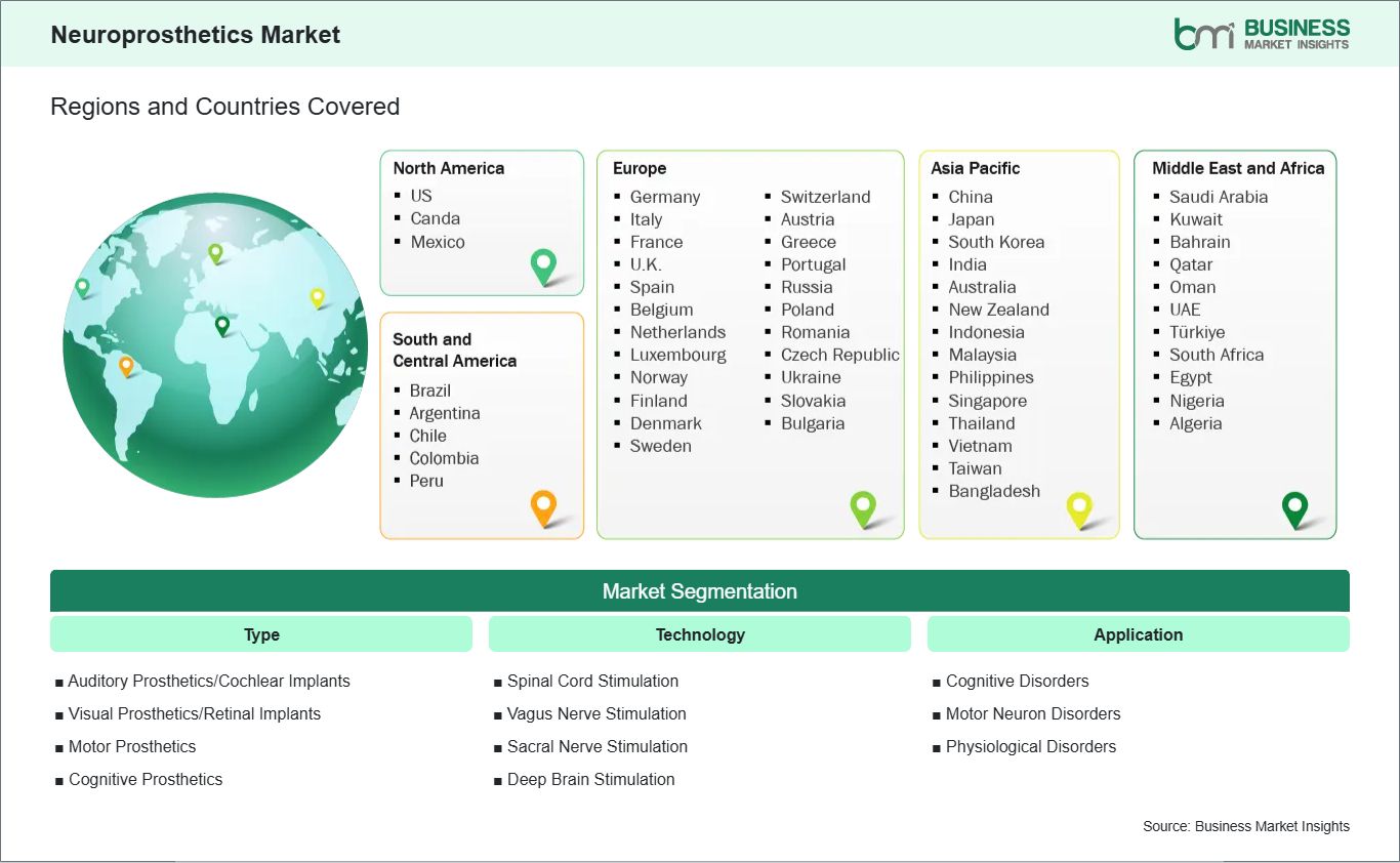 North America continues to advance neuroprosthetic adoption through strong R&D investments and supportive regulatory frameworks, fostering rapid innovation. Europe emphasizes reimbursement programs and collaborative research initiatives, accelerating clinical integration of advanced devices. Asia Pacific is emerging as a high-growth region, driven by expanding healthcare infrastructure and rising neurological disorder prevalence. The Middle East & Africa shows gradual progress, focusing on improving access to neuromodulation therapies. Latin America is witnessing incremental adoption through public–private partnerships and modernization of healthcare systems.