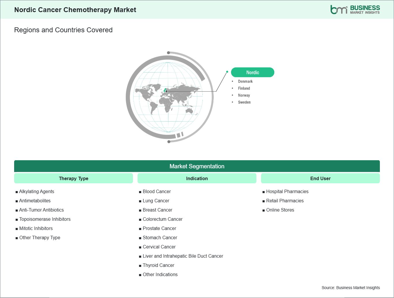 The "Nordic Cancer Chemotherapy Market Size and Forecast (2021–2031)" report provides a detailed analysis of the market covering below areas: