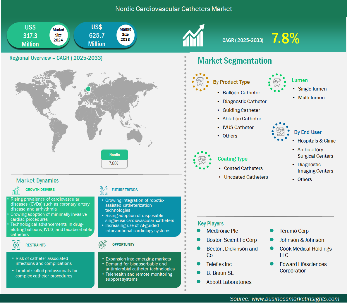 The Nordic cardiovascular catheters market size is expected to reach US$ 625.7 million by 2033 from US$ 317.3 million in 2024. The market is estimated to record a CAGR of 7.8% from 2025 to 2033.