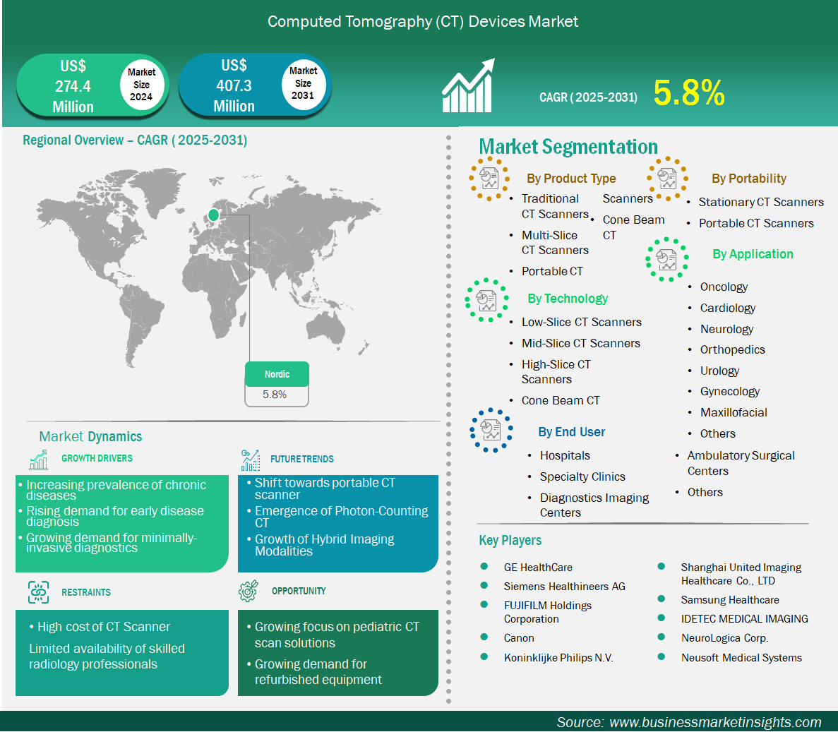 The Nordic Computed Tomography (CT) Devices Market is valued at US$ 274.4 Million in 2024, it is projected to reach US$ 407.3 Million by 2031.