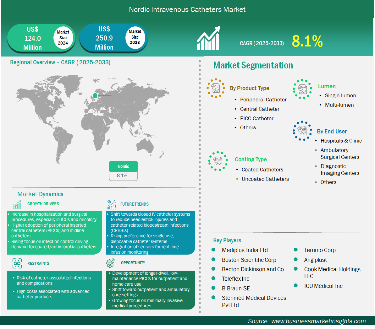 The Nordic intravenous catheters market size is expected to reach US$ 250.9 million by 2033 from US$ 124.0 million in 2024. The market is estimated to record a CAGR of 8.1% from 2025 to 2033.